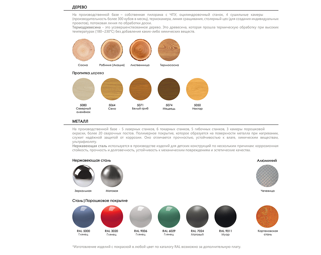 На производственной базе - 5 лазерных станков, 6 токарных станков, 5 гибочных станков, 3 камеры порошковой окраски, более 20 сварочных постов. Полимерное покрытие, которое образуется на поверхности металла при нагревании, служит надёжной защитой от коррозии. Оно отличается прочностью, устойчивостью к влаге, химическим веществам, ультрафиолету. Нержавеющая сталь используется в производстве изделий для детских конструкций по нескольким причинам: коррозионная стойкость, прочность и долговечность, устойчивость к механическим повреждениям и эстетические качества.