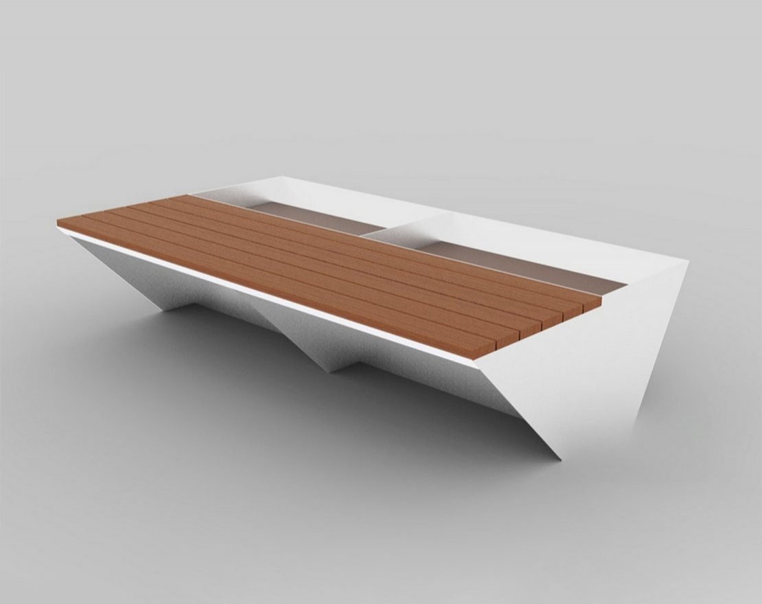 Скамья с совмещёнными клумбами или местами для установки цветочных горшков. Позволяет добиться интересных визуальных эффектов и совместить озеленение с удобством расположения людей.